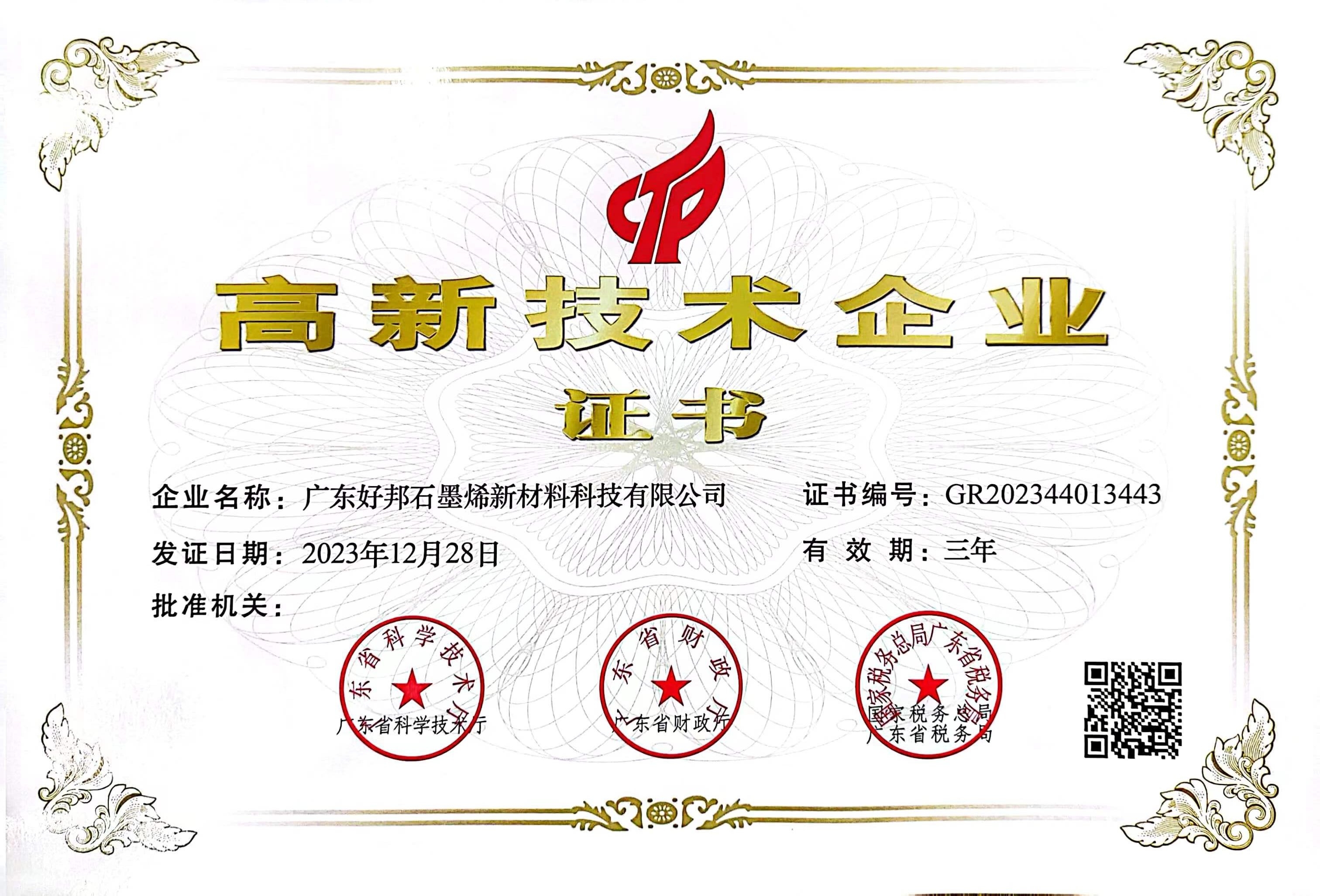 好邦石墨烯公司自成立以來,順利通過了IS09001:2015、IS045001:2018和ISO45001:2018管理體系認(rèn)證,并于2019年成功獲得“高新技術(shù)企業(yè)”認(rèn)定,這標(biāo)志著好邦在管理的科學(xué)化、標(biāo)準(zhǔn)化規(guī)劃化發(fā)展方面又上了一個新的臺階。